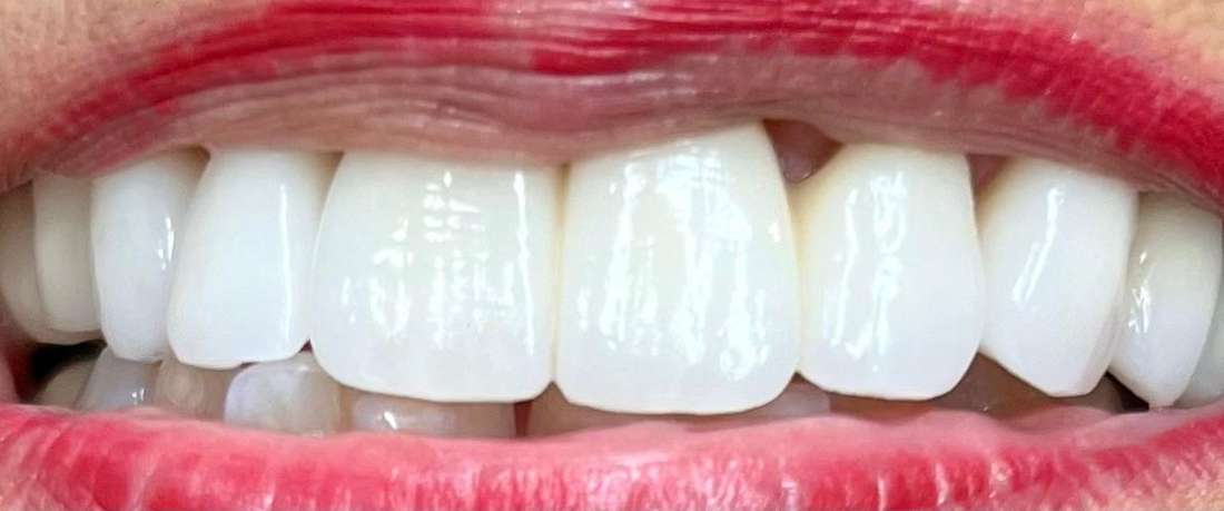This patient was wearing a removable partial upper denture to replace a missing front tooth and wanted a more permanent solution. We replaced her partial denture with a Porcelain and Zirconia Fixed Bridge which was permanently cemented onto her teeth.